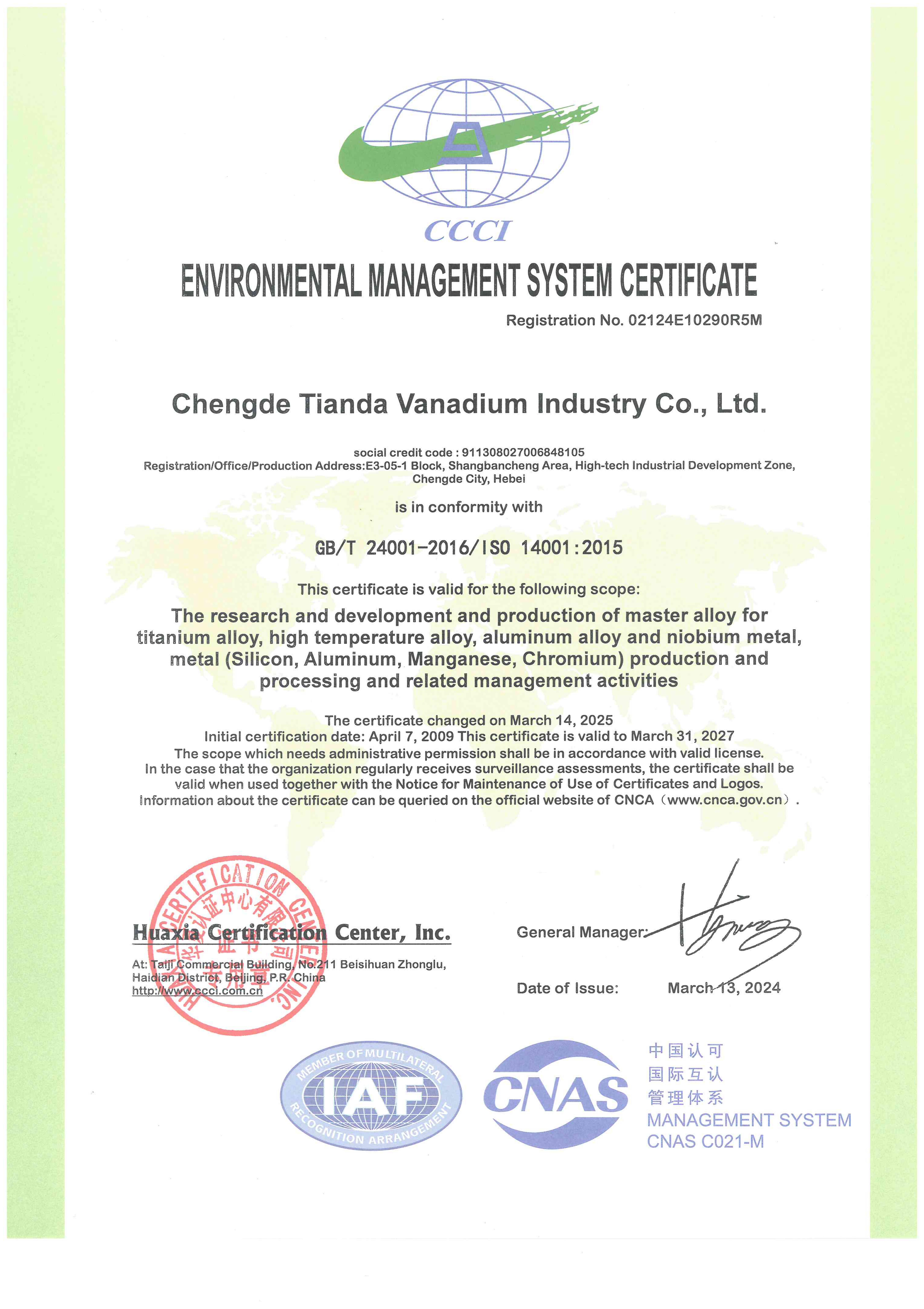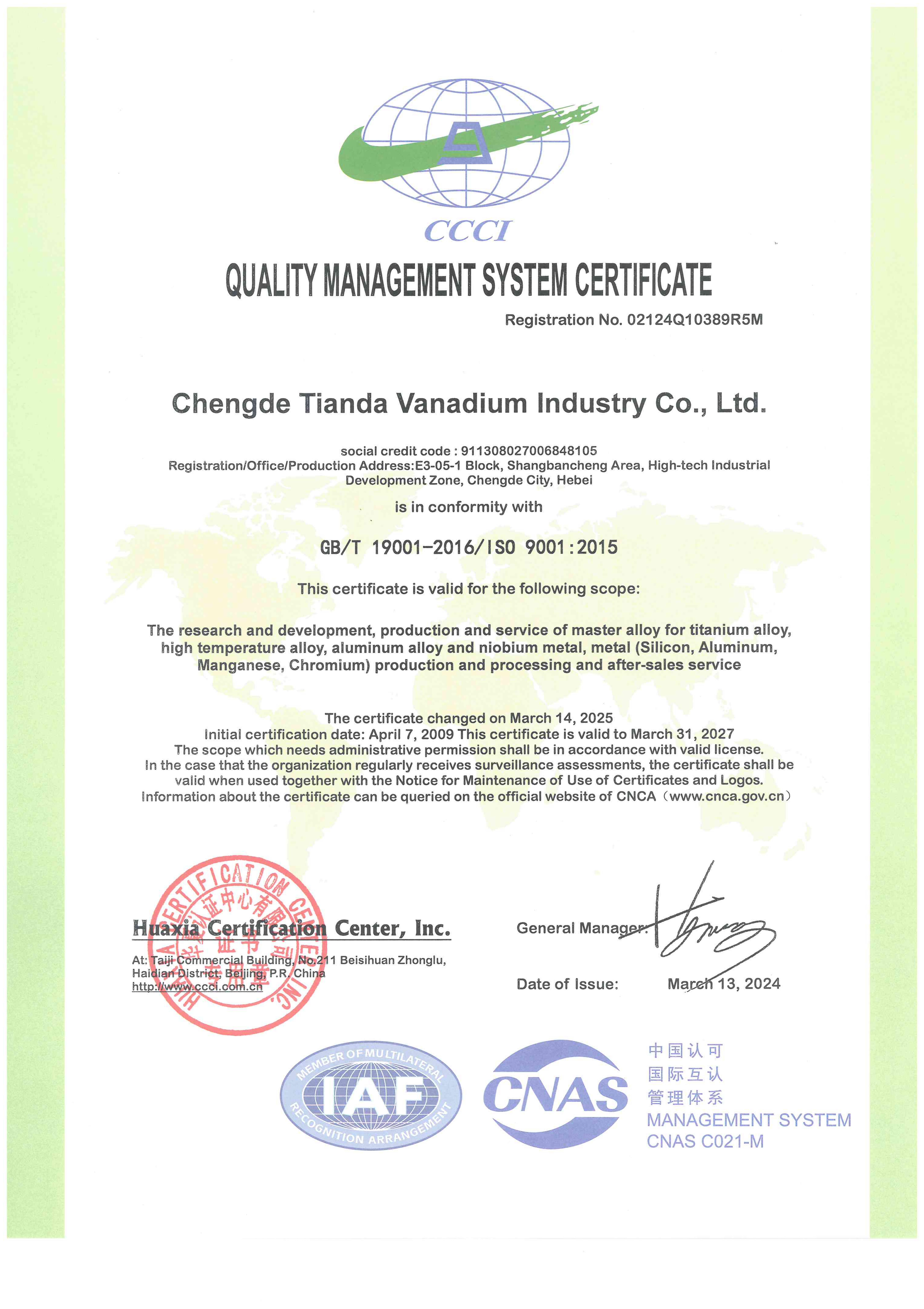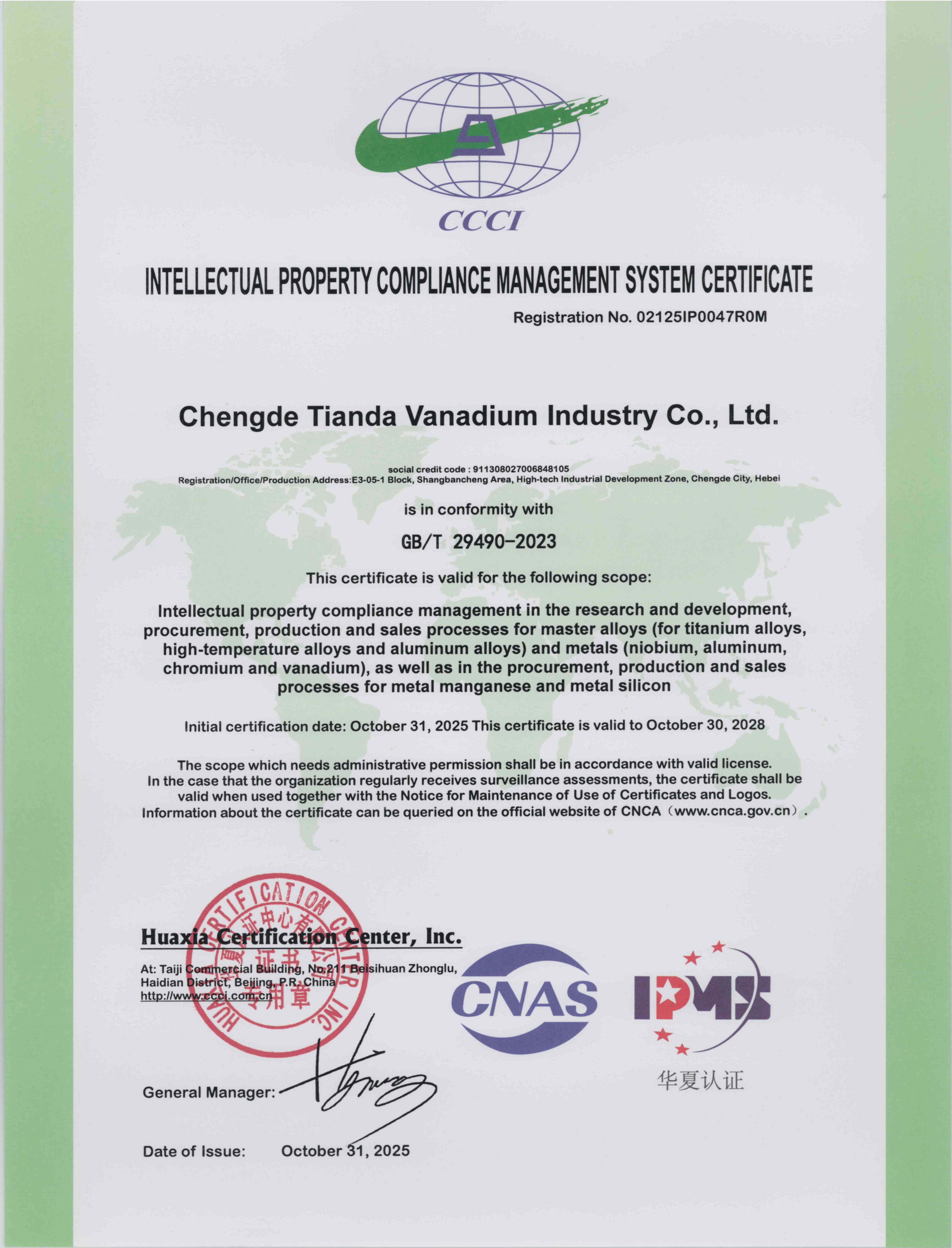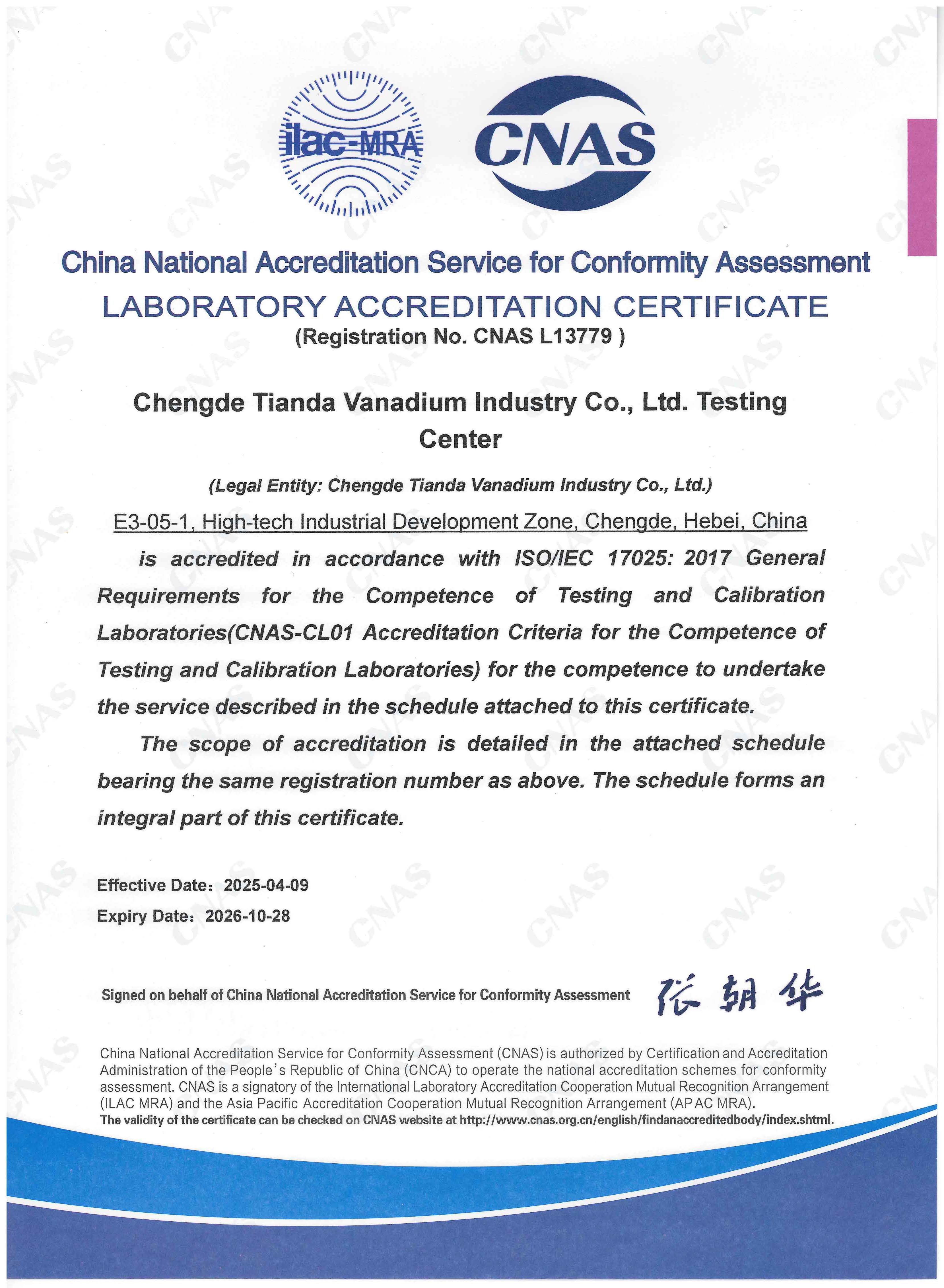 Chengde Tianda Vanadium Industry Co., Ltd., founded in 1998 in Chengde City, Hebei Province, has developed over two decades into a national high-tech enterprise and a national-level Specialized, Sophisticated, Unique and New “Little Giant” enterprise. With total assets of RMB 1035 million, the company has an annual production capacity of 5,200 tons of master alloys and 2,000 tons of high-purity metals.