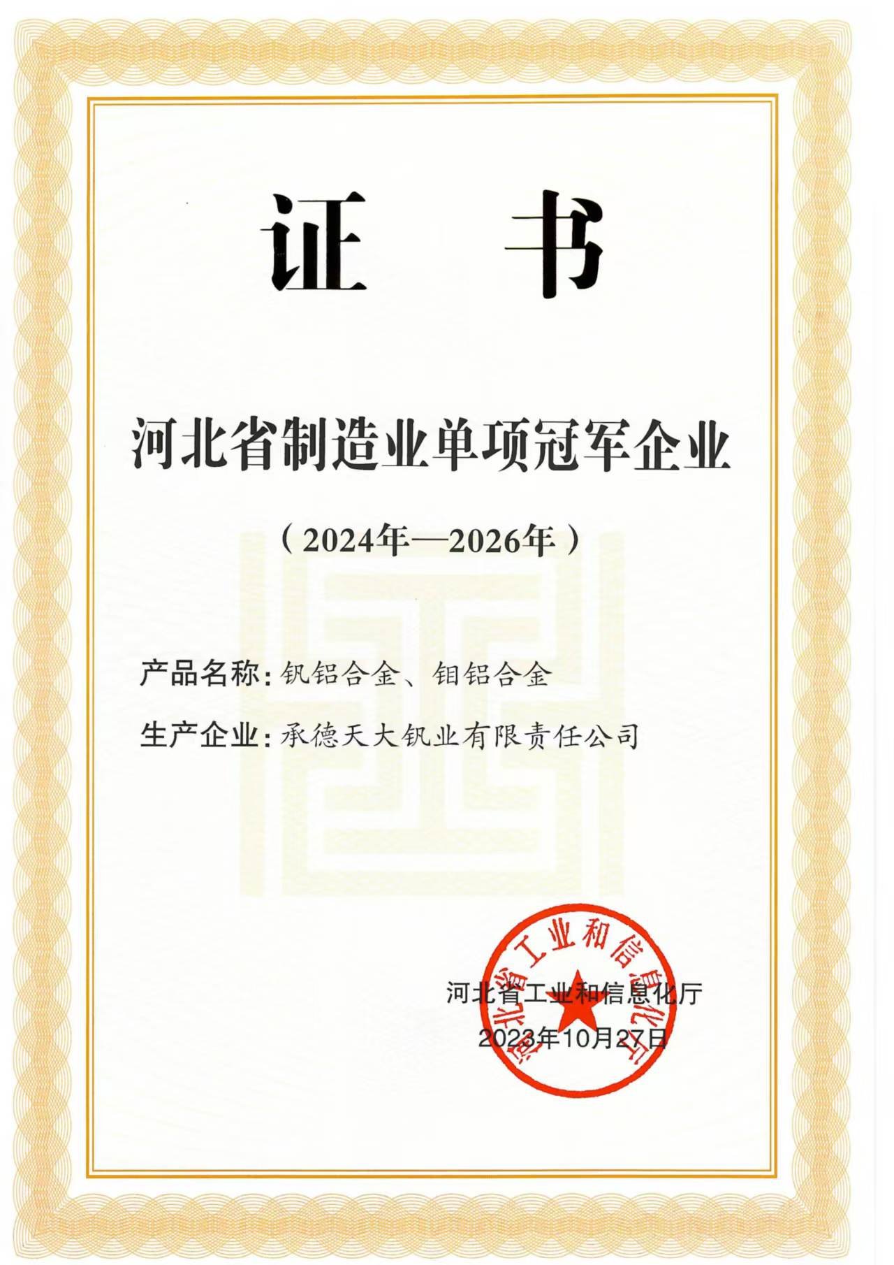 喜讯!天大钒业成功入选河北省省级制造业单项冠军企业!
